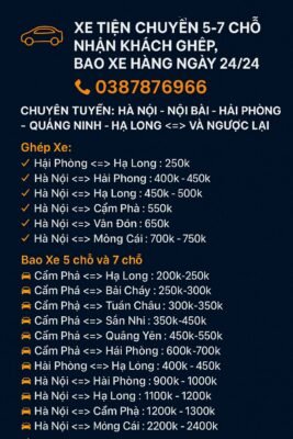 “🚘🚙 XE TIỆN CHUYẾN 5-7 CHỖ NHẬN KHÁCH GHÉP, BAO XE HÀNG NGÀY 24/24 ⏰⏰⏰ ☎️ 0387876966 ✨ CHUYÊN TUYẾN: HÀ NỘI -NỘI BÀI -HẢI PHÒNG -QUẢNG NINH -HẠ LONG <=> VÀ NGƯỢC LẠI 🚦 ✅ 𝐆𝐡𝐞́𝐩 𝐗𝐞: 👉 Hải Phòng <=> Hạ Long : 250k 👉 Hà Nội <=> Hải Phòng : 400k – 450k 👉 Hà Nội <=> Hạ Long : 450k – 500k 👉 Hà Nội <=> Cẩm Phả : 550k 👉 Hà Nội <=> Vân Đồn : 650k 👉 Hà Nội <=> Móng Cái : 700k – 750k ✅ 𝐁𝐚𝐨 𝐗𝐞 5 chỗ và 7 chỗ: 🚘Cẩm Phả <=> Hạ Long :200k-250k 🚘Cẩm Phả <=> Bãi Cháy : 250k-300k 🚘Cẩm Phả <=> Tuần Châu :300k-350k 🚘Cẩm Phả <=> Sản Nhi : 350k-450k 🚘Cẩm Phả <=> Quảng Yên : 450k-550k 🚘Cẩm Phả <=> Hải Phòng : 600k-700k 🚘 Hải Phòng <=> Hạ Long : 400k – 450k 🚘 Hà Nội <=> Hải Phòng : 900k – 1000k 🚘 Hà Nội <=> Hạ Long : 1100k – 1200k 🚘 Hà Nội <=> Cẩm Phả : 1200k – 1300k 🚘 Hà Nội <=> Vân Đồn : 1400k – 1600k 🚘 Hà Nội <=> Móng Cái : 2200k – 2400k ✅ Gửi hàng nhanh 𝐇𝐏 – 𝐇𝐍 – 𝐐𝐍: 𝐓𝐮̛̀ 𝟏𝟓𝟎𝐤 🔥 𝐗𝐞 𝟓-𝟕 𝐜𝐡𝐨̂̃ đ𝐨̛̀𝐢 𝐦𝐨̛́𝐢 𝐜𝐡𝐚̣𝐲 𝐡𝐚̀𝐧𝐠 𝐧𝐠𝐚̀𝐲 𝟐𝟒/𝟕, đ𝐨́𝐧 𝐭𝐫𝐚̉ 𝐭𝐚̣̂𝐧 𝐧𝐨̛𝐢, 𝐱𝐞 𝐜𝐡𝐚̣𝐲 𝐜𝐚𝐨 𝐭𝐨̂́𝐜 .𝐍𝐡𝐚̣̂𝐧 𝐠𝐮̛̉𝐢 𝐡𝐚̀𝐧𝐠 𝐜𝐨́ đ𝐚̉𝐦 𝐛𝐚̉𝐨!!! ☎️ Hotline / zalo: 0387876966″